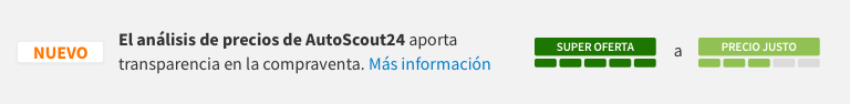 Con solo un par de clics podrás ponerte en contacto con el vendedor y encontrarás el coche -nuevo o de segunda mano- que cubra tus necesidades. En AutoScout24 encontrarás siempre cientos de opciones donde elegir. Dentro de los criterios de búsqueda recomendados puedes seleccionar la marca, el modelo, el tipo de combustible, el kilometraje, el color, así como otras características especiales y, por supuesto, el precio. Si quieres vender o comprar un coche nuevo o un coche de segunda mano, en AutoScout24 disfrutarás de todas las facilidades de venta, así como de cientos de ofertas y de posibilidades de financiación en todas las marcas de coches.
