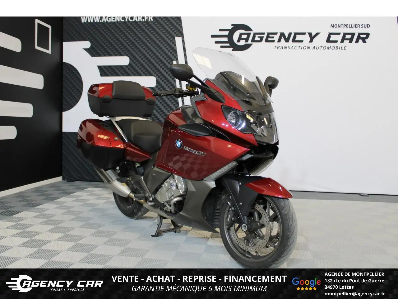 AGENCY CAR Showroom automobile à MontpellierDepuis 2014, AGENCY CAR vous accompagne dans vos projets d'achat de véhicules d'occasion avec sérieux et transparence.Notre agence de Montpellier vous propose ce véhicule :BMW 1600 GT, Rouge métallisé, 15 cv, première mise en circulation le 14-03-2012, garantie 6 mois. Véhicule visible UNIQUEMENT SUR RDV à l'agence de Montpellier (34). Du mardi au vendredi 10h - 18h30 et le samedi de 9h30 à 17h. - Financement possible de 12 à 72 mois. - Possibilité d'extension de garantie jusqu'à 48 mois. - Livraison dans toute la France (sur devis). - Des erreurs peuvent se glisser dans nos annonces, n'hésitez pas à nous contacter par téléphone pour plus de renseignements. Retrouvez également la vidéo 360° du véhicule sur notre site internet. Ne dispose pas de l'option Marche arrière ni Radio embarqué Véhicule similaire : Kawasaki 1400 GTR Yamaha FJR 1300 Truimph 1200 TrophyLes options : Frais d'agence : 490e, Éclairage Xénon intelligent directionnel et adaptatif, Béquille centrale et latérale + bulle haute confort réglable électrique, Bulle réglable électriquement, DTC Dynamic Traction Control système permettant le réglage selon l'état de la route, Dynamic ESA 2 Electronic Suspension Adjustement système de suspension pilotée électronique avec 3 réglages pluie / route / dynamique, GPS écran couleur tactile Navigator 4, Pack CONFORT avec alarme et verrouillage centralisé à distance avec télécommandes, Valises et Top Case BMW avec porte bagages et verrouillage centralisé
