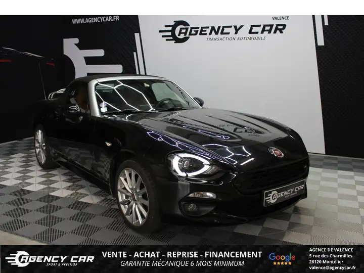 AGENCY CAR Showroom automobile à ValenceDepuis 2014, AGENCY CAR vous accompagne dans vos projets d'achat de véhicules d'occasion avec sérieux et transparence.Notre agence de Valence vous propose ce véhicule :FIAT 124 Spider Lusso Plus Echappement ABARTH, Noir, 8 cv, 2 portes, première mise en circulation le 20-06-2016, garantie 6 mois.Véhicule visible UNIQUEMENT SUR RENDEZ-VOUS à l'agence de Valence (26).Horaires d'ouverture :Mardi au Vendredi : 10h - 12h / 13h - 18hSamedi : 10h - 15hFinancement possible de 12 à 72 moisGarantie jusqu'à 24 mois en optionLivraison dans toute la France (sur devis)Des erreurs peuvent se glisser dans nos annonces. Merci de nous contacter pour toute confirmation d'équipements ou d'informations.Vidéo 360° du véhicule disponible sur www.agencycar.frLes options : Peinture métallisée, Sièges chauffants, Système audio hi-fi Bose 9 HP, ABS avec répartiteur de freinage EBD, Airbags conducteur et passager, Frais de dossier 690 euros, Caméra de recul parkview, Climatisation automatique, Double sorties d'échappement chromée, Feux arrière à LED, Feux diurnes à LED, Montant de pare-brise couleur argent, Phares avant à LED, Phares directionnels adaptatifs, Prise auxiliaire (12V), Projecteurs antibrouillard, Régulateur de vitesse, Sellerie cuir, Système d'ouverture sans clé, Système de navigation avec carte SD, Système multimédia avec écran tactile 7'' (Radio, Bluetooth, 2 prises USB, AUX), Tapis de sol, Vitres électriques, Volant gainé cuir avec commandes audio