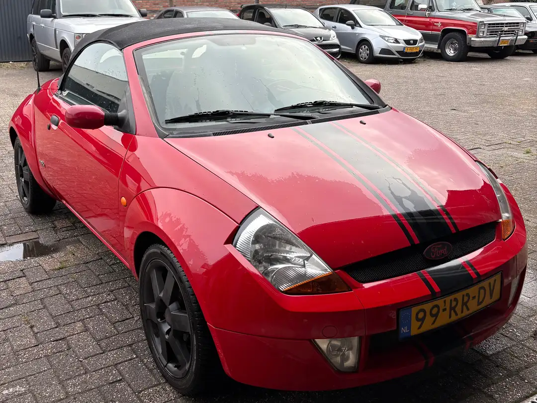 Leuke en sportieve Ford StreetKa in het rood met zwarte velgen en zwarte striping. Een compacte cabriolet waar mee je heerlijk open kunt rijden.