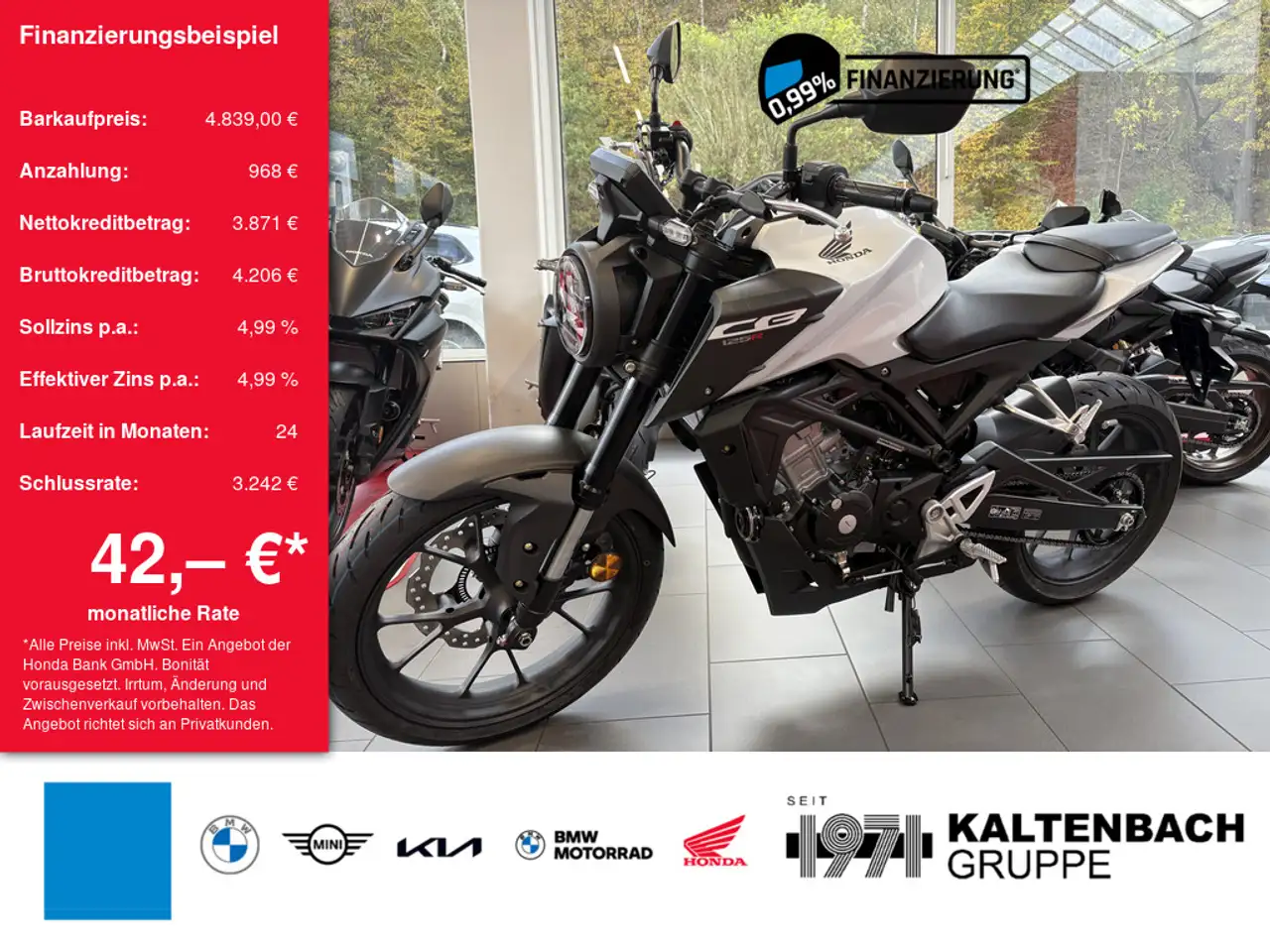 *Ein Finanzierung mit Schlussrate-Finanzierungsbeispiel der Honda Bank GmbH, Hanauer Landstraße 222-226, 60314 Frankfurt am Main für Privatkunden: 41,89 EUR monatl. Rate, 4,99 Prozent eff. Jahreszins bei 24 Monaten Laufzeit, einer Anzahlung von 967,80 EUR und einer Schlussrate von 3.242,13 EUR. (Sollzins gebunden p.a. 4,99 Prozent, Gebühren 0,00 EUR, Bruttokreditbetrag: 4.205,56 EUR, Nettokreditbetrag: 3.871,20 EUR)