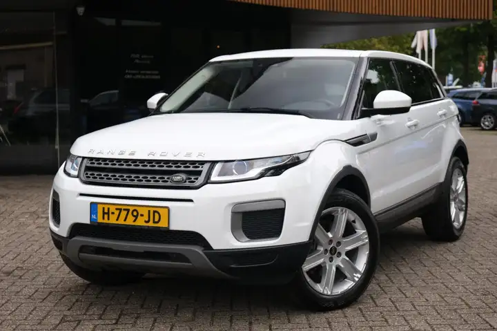 Deze uitvoering is afgewerkt in een stijlvolle wit metallic lak, die prachtig contrasteert met het zwart stoffen comfortinterieur. Het design van de Evoque is compact maar toch krachtig, met de herkenbare Land Rover-lijnen en een premium uitstraling.
