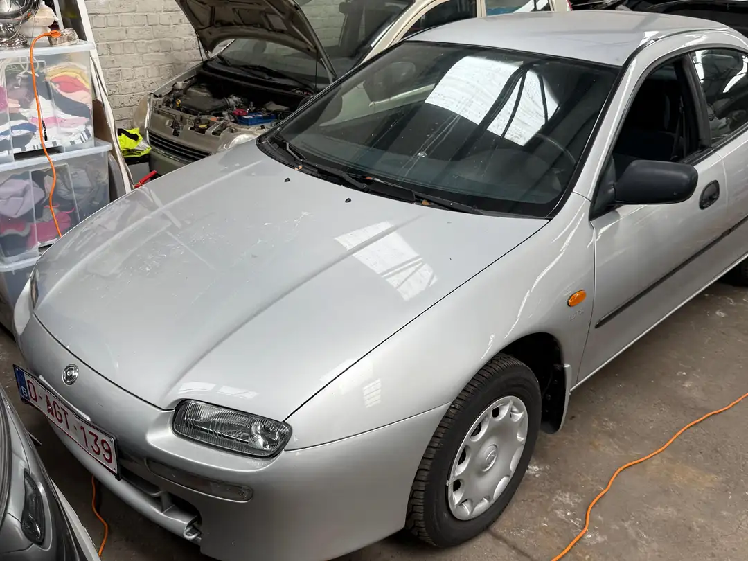 Mazda 323 1.5i 16v benzine – handgeschakelde transmissie, ongevalvrij. Vierdeurs sedan uit 1996 met 160.000 km, momenteel niet ingeschreven (restauratie nodig).