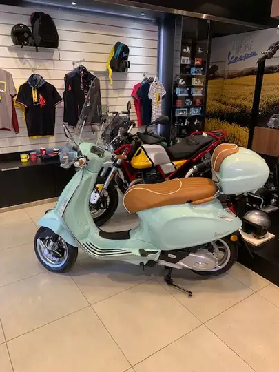 Vespa tailor made con sedile manopole e sotto sella in pelle. In dotazione anche blocco antifurto e due caschi dello stesso colore della vespa