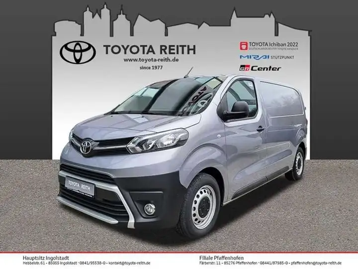 3-Punkt-Sicherheitsgurte auf allen Sitzp, ABS mit EBD, Ablagen, Airbag: Frontairbags Fahrer/Beifahrer, Außenspiegel elektr. verstellbar, behei., Brems-Assistent (BA), Bremsleuchte, dritte, LED, Deckenbeleuchtung Laderaum, Drehzahlmesser, Ersatzrad, befestigt unter dem Fahrzeug., Fahrer-Aufmerksamkeitsassistent, Fensterheber vorne, elektrisch, Geschwindigkeitsregelanlage/-begrenzer, Getriebe: 6-Gang-Schaltgetriebe, Heckflügeltüren, verglast mit beheizbaren Heckscheiben und Heckwischern mit Öffnungswinkel 180° - inkl. Trennwand mit Fenster und Innenspiegel, Heckkamera, Klimaanlage, manuell, Kopfstützen vorn, höhenverstellbar, Lackierung: Metallic-Lackierung, Laderaumboden, Holz mit Antirutsch-Ob., Lenkrad, höhen- und längsverstellbar, Leselampen vorne, Leuchtweitenregulierung, Multi-Informations-Display, Multimedia-Audiosystem Toyota ProTouch, Navigationssystem Toyota ProTouch&Go 3D-Navigation, wahlweise 2D-Navigation 7-Farbmonitor mit Touchscreen-Funktion Sprachsteuerung Informationen über Geschwindigkeitsbegrenzung, Verkehrslage, Parkplätze und Kraftstoffpreise Wetter und POI-Informationen Parksensoren vorn und hinten Toter-Winkel-Warner Smartphone-Integration Apple CarPlay, Android Auto Nebelscheinwerfer Außenspiegel, elektrisch anklappbar, Paket: Sicht-Paket, Parksensoren hinten, Partikelfilter: Rußpartikelfilter, Polster: Stoff, Räder: Stahlfelgen 16, 215/65 R16, Schiebetür rechts, geschlossen, Servolenkung, elektrisch, Sitze: Comfort Fahrersitz, Sitze: Doppelbeifahrersitzbank, Sitze: Fahrersitz höhenverstellbar, Sitze: Fahrersitz höhenverstellbar, Sitze: Lordosenstütze Fahrer, Start-Stop-System, Steckdosen 12 V, Steckdosen 12 V, Steckdosen 12 V im unteren Handschuhfach, Tagfahrlicht, Toyota Smart Cargo, Trennwand geschlossen, VSC (elektronische Stabilitätskontrolle), Verzurrösen (6) im Laderaum, Wegfahrsperre, elektronisch, Zentralverriegelung m. Funkfernbedienung, Zusätzliche Zeigerinstrumente, ... Änderungen, Zwischenverkauf und Irrtümer vorbehalten.