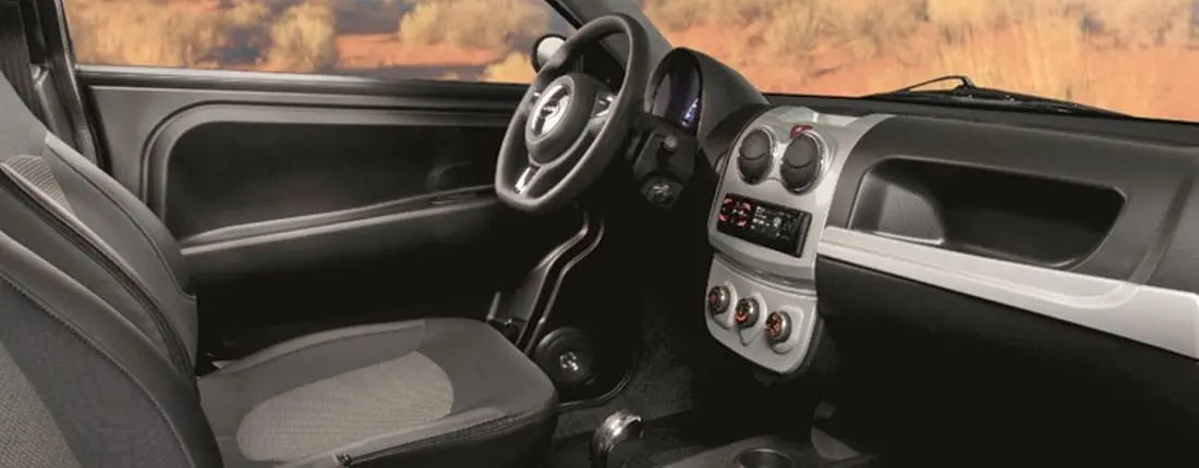 Tiene un equipamiento bastante limitado de serie: asientos reclinables para conductor y pasajero, salpicadero rediseñado con cuadro de instrumentos analógico y digital, llave retráctil, cierre centralizado con mando a distancia, luces LED diurnas, elevalunas eléctrico, toma de 12 V, techo bicolor metalizado y preinstalación de radio para doble DIN.