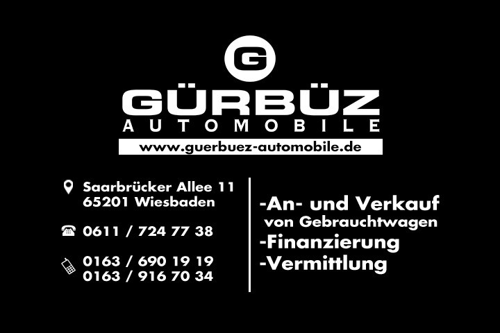 GÜRBÜZ-AUTOMOBILE WIESBADEN Freier Händler für Maserati, Freier Händler für BMW, Freier Händler für Porsche, Freier Händler für Audi, Freier Händler für Opel, Freier Händler für Volkswagen, Freier Händler für ABG, Freier Händler für Mercedes-BenzSaarbrücker Allee 11 65201 Wiesbaden Deutschland www.Guerbuez-Automobile.de email: guerbuez-automobile@mobile.de Tel.: +49 611 7247738 2. Tel.-Nr.: +49 1577 766 1994 Sie können Ihre Fragen an unser Team in folgenden Sprachen stellen: Deutsch, English, Türkçe