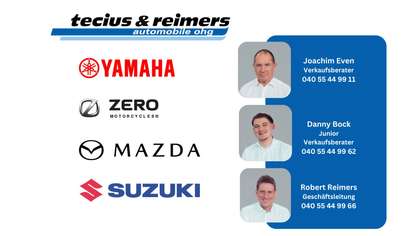 Hanseatische Tradition seit 1962 Die Firma Tecius & Reimers Automobile ist ein Familienunternehmen. 1962 gegründet, wird sie heute in zweiter Generation von den Brüdern Baldur N.C. Tecius und Robert Reimers geleitet. Seit 1976 ist das Unternehmen Mazda-Vertragshändler. Es zählt zu den erfolgreichsten Mazda- / Suzuki PKW- / Yamaha- / Zero Vertretungen Deutschlands. Im Dezember 2005 wurde der 1.600 Quadratmeter große Neubau eingeweiht - Hamburgs modernstes Mazda-Autohaus. Doch Größe ist nicht alles. Trotz aller modernen Errungenschaften ist dem 35-köpfigen Team vor allem eines wichtig: Die Kunden in familiärer Atmosphäre zu empfangen und ihnen in allen Fragen rund ums Auto mit Rat und Tat zur Seite zu stehen. Unsere Dienstleistungen : Au Abgastest, HU Hauptuntersuchung (TÜV), Motorinstandsetzung, Abschlepp-/Pannendienst, Autoaufbereitung, Autoelektrik, Autozubehör, Ersatzteilexpressversand, Ersatzteilverkauf, Ersatzwagen, Fahrräder, Fahrwerksumbauten, Finanzservice, Gabel und Stoßdämpferservice, Gutachten bei Unfallfahrzeugen, Karosserie, Klimaanlagenservice, Motorradbekleidung, Motorradelektrik, Motorradzubehör, Motorrädergebraucht und neu, Yamaha, Zero Elektromotorräder, Mazda, Rahmenrichtbank, Reifenservice, Reifeneinlagerung, Reifenverkauf, Roller, 125er, Schnellservice, Telefonverkauf, Tuning, Veredelung, Umbauten, Reparatur, Meisterwerkstatt, Versicherungen, Waschanlage, Werkstatt, Zulassungsservice, Achsvermessung, Reifengas, Yamaha ATV, Side by Side uns Quads,